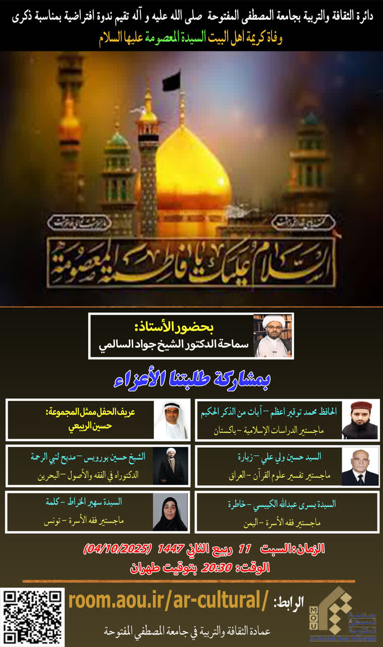 📌دائرة الثقافة والتربية بجامعة المصطفى المفتوحة صلى الله عليه و آله تقيم ندوة افتراضية بمناسبة ذكرى وفاة كريمة اهل البيت السيدة المعصومة (عليها السلام):