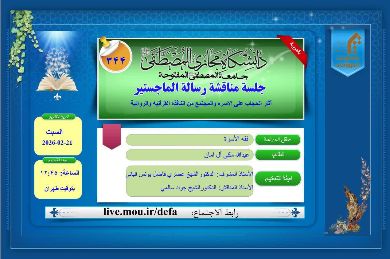 جلسه دفاع از پایان‌نامه کارشناسی ارشد با عنوان: آثار الحجاب علی الاسرة والمجتمع من النافذة القرآنية والروائية
