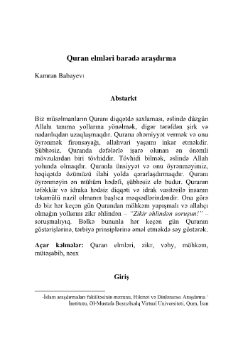 Açar kəlmələr: Quran elmləri, zikr, vəhy, möhkəm,