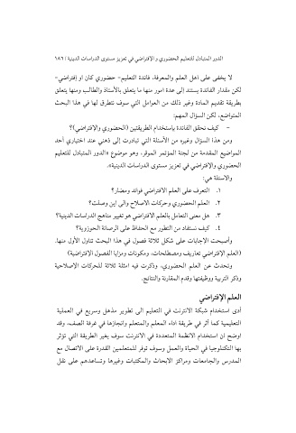 186 / ةینيدلا تاساردلا یوتسم زيزعت ف ي يضارتفلإا و يروضحلا میلعتلل لدابتملا رودلا