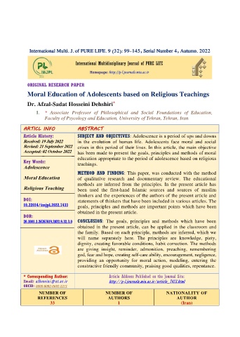 International Multi. J. of PURE LIFE. 9 (32): 99-145, Serial Number 4, Autumn. 2022
