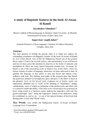 Key Words: Aziz al-Din ibn Muhammad Nasafi, Al-Ansan Al-Kamil,