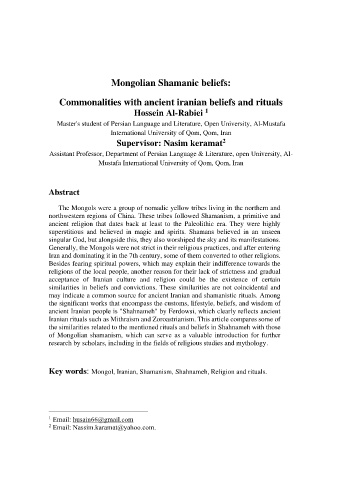 Key words: Mongol, Iranian, Shamanism, Shahnameh, Religion and rituals.