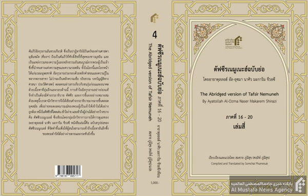 جلد چهارم منتخب تفسیر نمونه حضرت آیت الله العظمی مکارم شیرازی شامل جزء شانزدهم تا بیستم قرآن کریم توسط شیخ صالح از دانش آموختگان المصطفی تدوین و به زبان تایی ترجمه شد و در نمایندگی المصطفی در تایلند پس از ویرایش و آماده سازی در قطع وزیری به چاپ رسید.