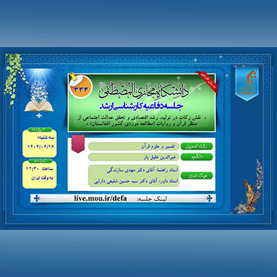 جلسه دفاع از پایان‌نامه کارشناسی ارشد با عنوان: نقش زكات در توليد، رشد اقتصادي و تحقق عدالت اجتماعي از منظر قرآن و روايات (مطالعه موردی كشور افغانستان)